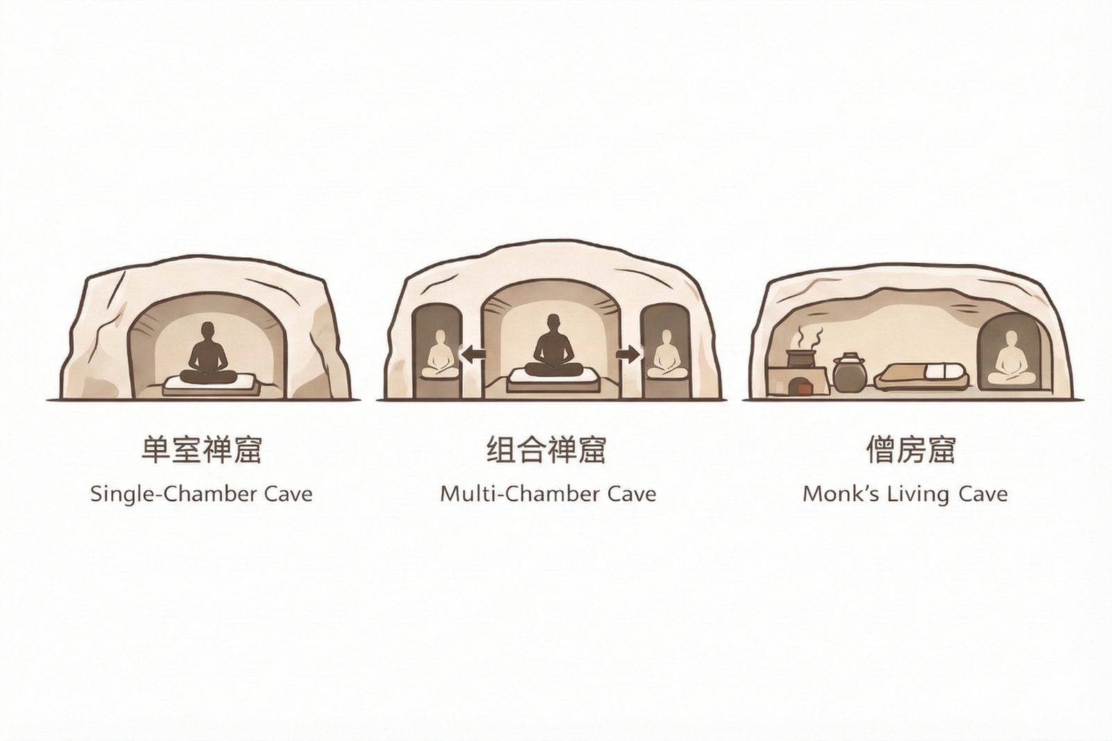 它们像是岩壁里的修行居所。能坐、能住、能长期停留,让修行从仪式走向生活。